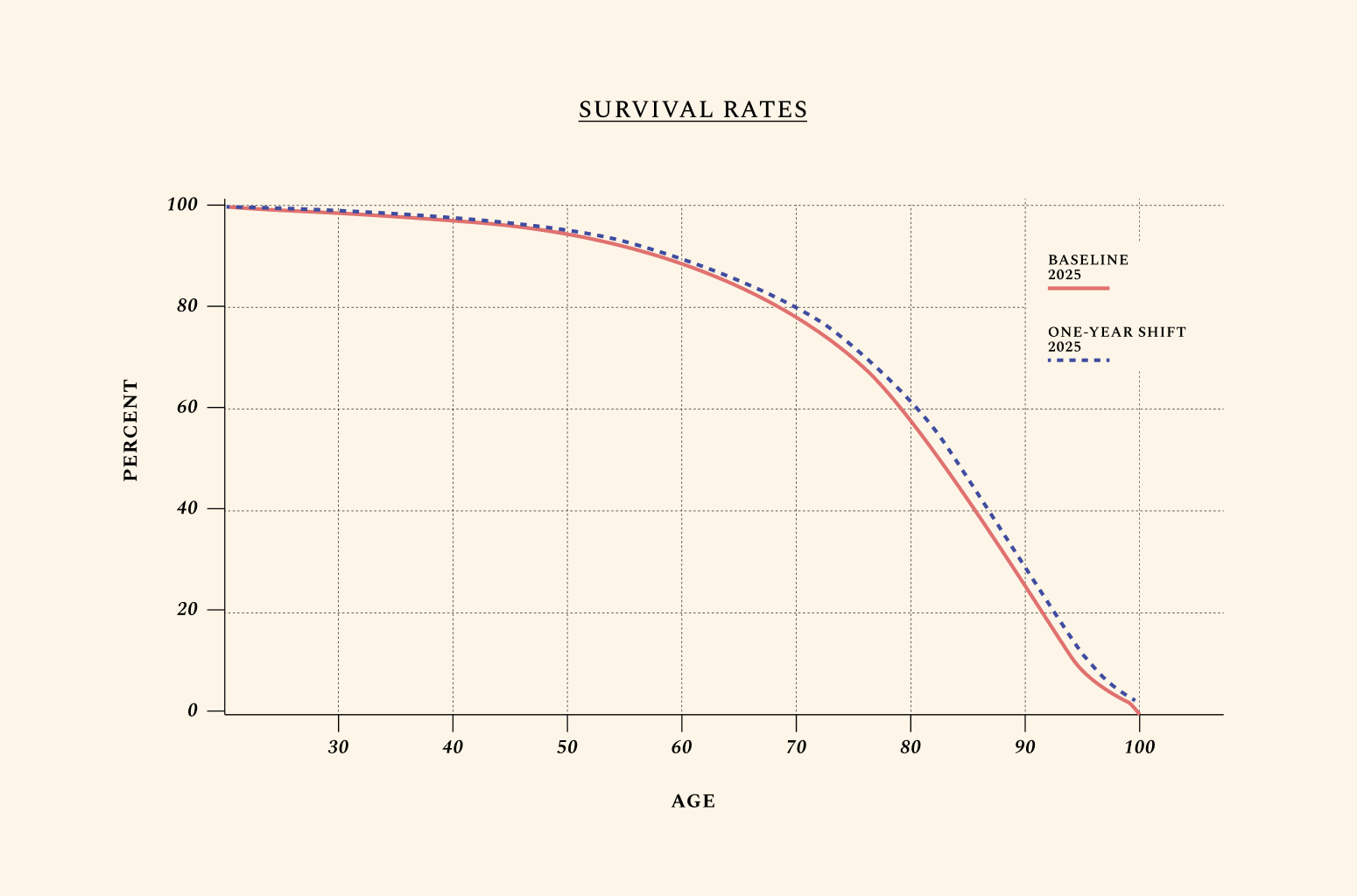 By looking at mortality, productivity, and fertility rates — and their stunningly predictable relationship with age — we bypass the problem of confounding “health” with “biological youth.” In other words, the world we are painting is not one where 85-year-olds are told they are healthy for their age. It’s a world where 85-year-olds suffer from the conditions of aging at the rate of biologically younger adults.