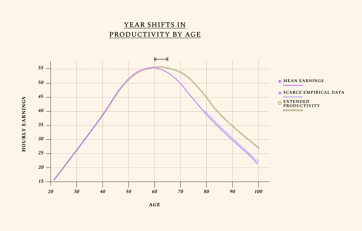 Human lifetime earnings follow a near-perfect triangle shape. We illustrate U.S. mean earnings, with a focus on hourly wages. Of course, older adults work fewer hours than younger ones, which means their total earnings are still often lower. We also only consider voluntary labor force participation for adults ages 66+. Yet healthspan — and expected healthspan — is often the primary factor informing the number of hours people work. Interestingly, adults who know they have fewer years to live work less. To fully understand how we model disutility of labor with age, see our preprints and book ("About"). Improvements in the biology of aging are unique relative to other health investments in that they can extend one’s productive time at the apex of this triangle, leveraging decades of experience, wisdom, and acquired knowledge.
